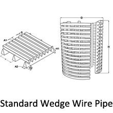 Standard wedge wire wrapped screen pipe (external circumferential wire and axial internal support rods) is a kind of strainers that flow from outside to inside filtration, with smooth external screen surface. This type wedge wire screen pipe is manufactured by wrapping and welding stainless steel V-shaped profile wire cylindrically around support rods under automatic specialized wedge wire screen machine.